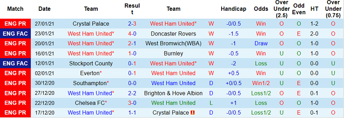 - Thống kê 10 trận gần nhất của West Ham