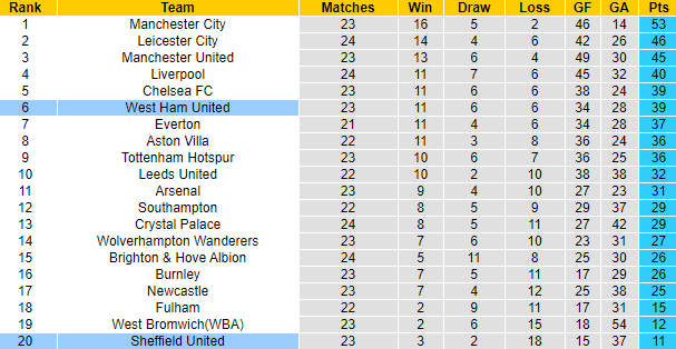Phong độ và thống kê đối đầu West Ham vs Sheffield United