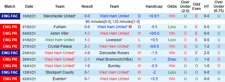 9 trận vừa qua tính trên mọi đấu trường, Sheffield United giành chiến thắng tới 6 trận. Trên sân khách 3 trận gần nhất, Sheffield United toàn thắng theo kèo châu Á. Trong khi đó giai đoạn gần đây West Ham lại cho thấy dấu hiệu sa sút. Đoàn quân của HLV David Moyes chỉ thắng được 1 trận trong vòng 4 lần xuất quân vừa qua (thua 1, hoà 2). Trên sân nhà, West Ham thua 5 trên 7 trận gần đây theo kèo châu Á.
