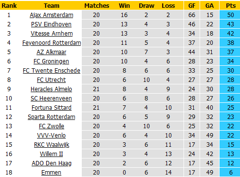 BẢNG XẾP HẠNG VĐQG Hà Lan