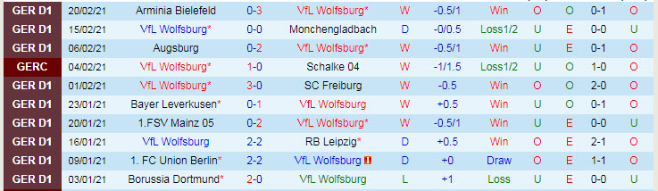 + Thống kê 10 trận gần nhất của Wolfsburg