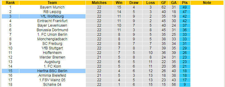 Tất nhiên, Wolfsburg vẫn cần nỗ lực hơn nữa và trước mắt họ sẽ là mục tiêu có trọn 3 điểm ở lượt trận đêm nay trước Hertha. Nhìn quan, đây là nhiệm vụ dễ dàng khi họ được chơi trên sân nhà. Cần nhớ, Wolfsburg đang là 1 trong 3 đội chưa từng thất bại trên sân nhà tại giải VĐQG mùa này với 6 trận thắng và 4 trận hòa.