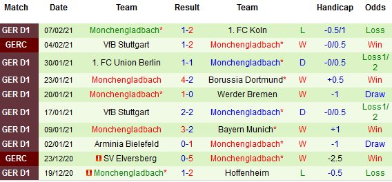 + Thống kê 10 trận gần nhất của M'gladbach
