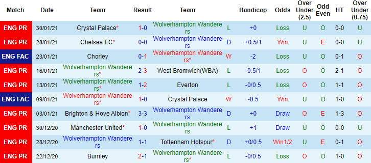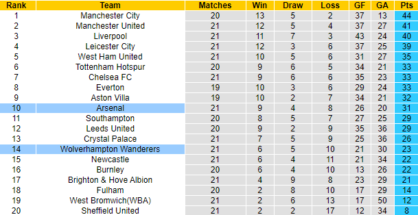 Trận đối đầu giai đoạn lượt đi Premier League mùa này, Wolves đánh bại Arsenal với tỷ số 2-1 ngay trên sân Emirates. Trong vòng 6 lần chạm trán Pháo thủ gần đây tính trên mọi đấu trường, Wolves bất bại tới 5 lần với 2 chiến thắng và 3 trận hòa.
