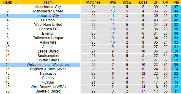 Leicester đang xếp thứ 3 trên bảng xếp hạng Ngoại hạng Anh mùa này với 42 điểm sau 22 trận. Trong khi đó Wolves sau 22 trận mới giành được 26 điểm, xếp ở vị trí thứ 14. Với vị thế hiện tại, Leicester hoàn toàn xứng đáng được đánh giá cao hơn Wolves ở trận đối đầu sắp tới. Tuy nhiên, Bầy cáo không nhận được nhiều sự tin tưởng vào khả năng giành chiến thắng.