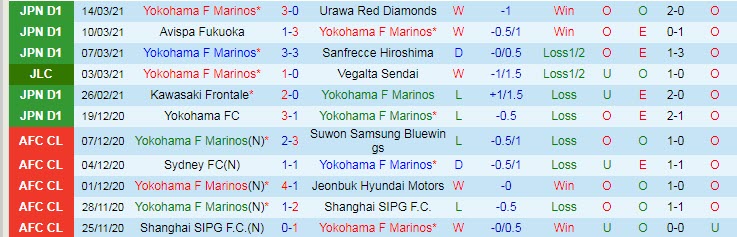 + Thống kê 10 trận gần nhất của Yokohama F Marinos