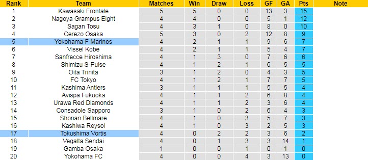 Phong độ và thống kê đối đầu Yokohama F Marinos - Tokushima Vortis gần đây: