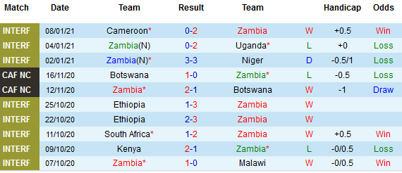 + Thống kê 10 trận gần nhất của Zambia