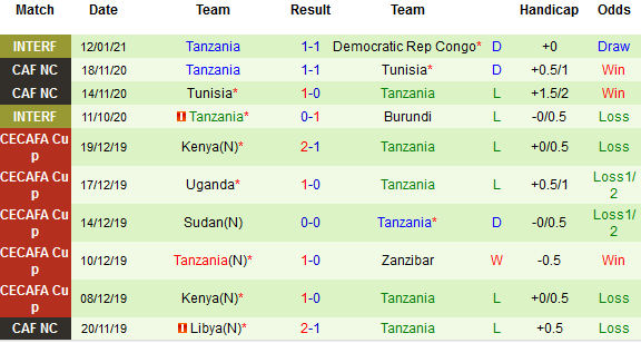 + Thống kê 10 trận gần nhất của Tanzania