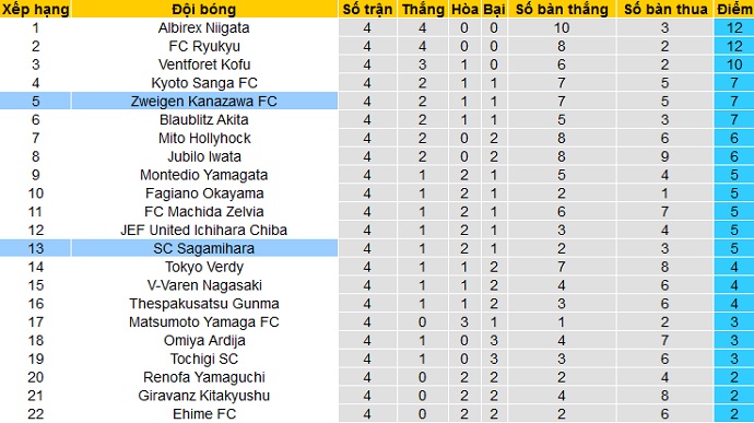 Sau 4 vòng đầu tiên của giải hạng nhì Nhật Bản, Zweigen Kanazawa đang có được 7 điểm và hiện đang đứng thứ 5 trên bảng xếp hạng. Có bằng điểm với 2 đội bóng khác và chỉ hơn kém về chỉ số phụ nhưng hiện tại Zweigen Kanazawa đã bị 2 đội đầu bảng bỏ xa tới 5 điểm.