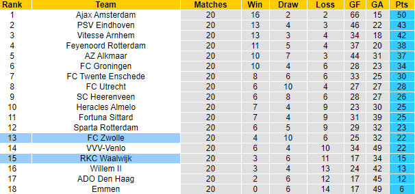 Zwolle đứng thứ 13 với 22 điểm, trong khi Waalwijk gặp khó khăn hơn đôi chút với vị trí thứ 15. Waalwijk chỉ còn hơn vị trí cầm đèn đỏ phía sau có 2 điểm, cách biệt khá mong manh và có thể bị san lấp bất kỳ lúc nào.