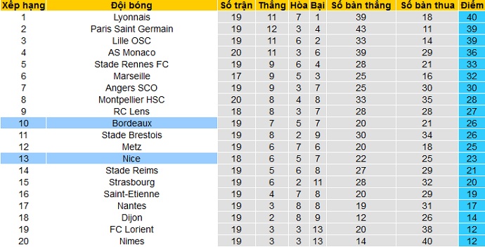 Trong khi đó Bordeaux cũng chỉ đang đứng ở giữa bảng xếp hạng tại vị trí thứ 10 với 26 điểm sau 19 vòng đấu. Khoảng cách của đội bóng đến các đội trong Top 5, có suất dự cúp châu Âu hiện vẫn đang là 7 điểm.