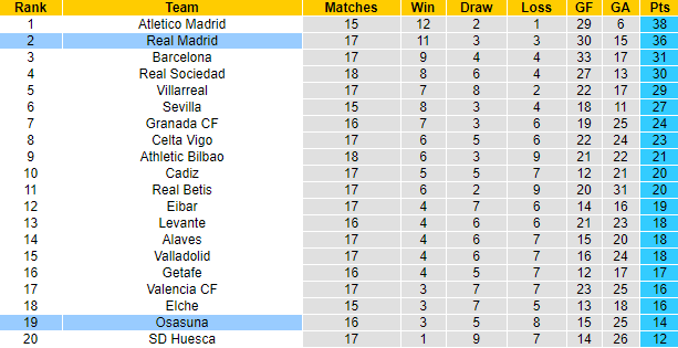 7 lần đối đầu Real Madrid gần đây, Osasuna toàn thua với cách biệt 2 bàn trở lên. 3 lần làm khách gần nhất trên sân của Osasuna, Kền kền trắng toàn thắng, ghi 9 bàn và chỉ 2 lần để thủng lưới. Trên bảng xếp hạng La Liga 2020/21, Real Madrid đang xếp thứ 2 với 36 điểm sau 17 trận. Kém đội đầu bảng Atletico Madrid 2 điểm, đội bóng Hoàng gia Tây Ban Nha càng có thêm động lực để hướng về chiến thắng trong 90 phút sắp tới.