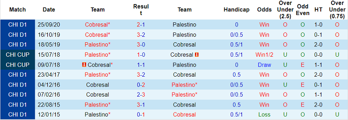 Cobresal toàn thắng hai lần so tài gần nhất thuộc khuôn khổ giải VĐQG Chile với Palestino. Nhưng cả hai chiến thắng đều diễn ra trên sân nhà của Cobresal. Mọi thứ hứa hẹn khác đi khi Cobresal phải làm khách.