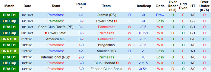 - Thống kê 10 trận gần nhất của Palmeiras