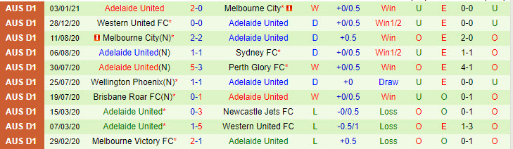 + Thống kê 10 trận gần nhất của Adelaide