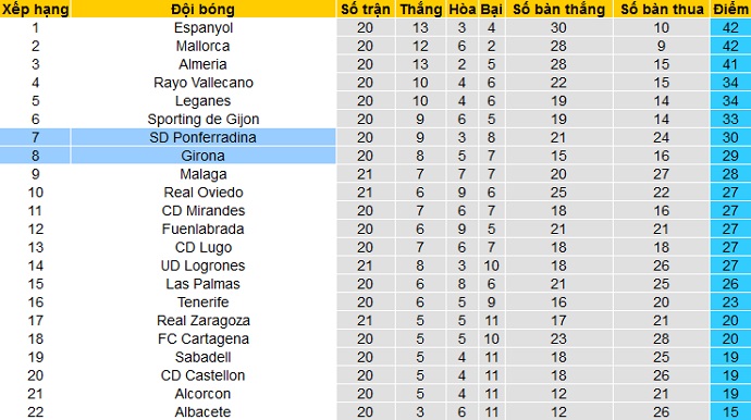 Trong khi đó Girona đang đứng ngay dưới đối thủ ở vị trí thứ 8 với chỉ 1 điểm ít hơn cũng sau 20 trận đã đấu. Tuy nhiên cả hai đội đang bị các đội phía sau bám đuổi rất sát khi khoảng cách giữa Girona và đội đứng thứ 14 cũng chỉ là 2 điểm.