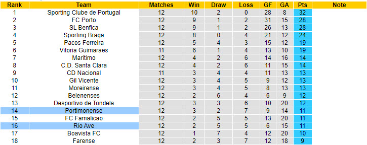 Bảng xếp hạng VĐQG Bồ Đào Nha vòng 13