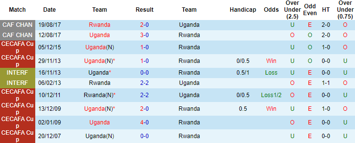 Cụ thể, trong vòng 11 lần chạm trán Rwanda trước đây, Uganda bất bại tới 10 lần với 6 chiến thắng và 4 trận hòa. Vì vậy ở trận đối đầu sắp tới, không bất ngờ khi Uganda được đánh giá cao hơn hẳn trước giờ bóng lăn. Tuy nhiên, điều đáng bàn là Rwanda đang nhận được nhiều sự tin tưởng vào khả năng thoát thua.