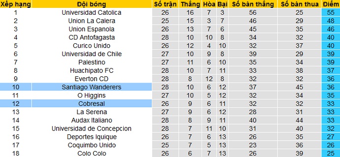 Trong khi đó Cobresal cũng chỉ đứng dưới đối thủ 2 bậc ở vị trí thứ 12 với 33 điểm có được sau 26 vòng đấu. Cơ hội lọt vào Top 8 của Cobresal vẫn đang rộng mở khi đội bóng thi đấu ít hơn 2 trận so với đa số các đội bóng khác.