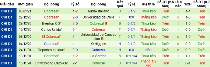 Ở 5 trận đấu gần đây Cobresal cũng có được 3 trận thắng và để thua 2 trận. Tuy nhiên thành tích sân khách của Cobresal khá tệ khi ở 5 lần du đấu gần nhất đội bóng chỉ thắng 1, hòa 1 và để thua 3 trận.