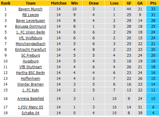Ghi được ít bàn thắng nhất với 8 lần sút tung lưới đối phương, Schalke cũng là đội nhận nhiều bàn thua nhất giải với 39 bàn. Nói tóm lại, gặp đối thủ nào cũng là thử thách quá lớn cho Hoàng đế Xanh.