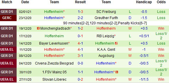 + Thống kê 10 trận gần nhất của Hoffenheim