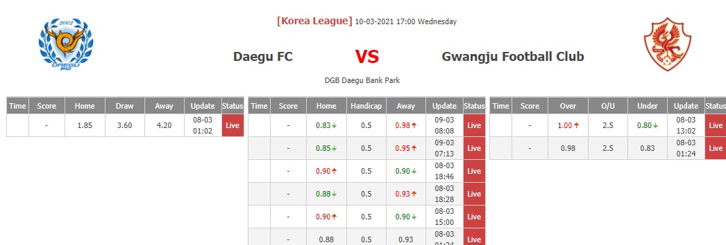 Theo nhận định của giới điều hành châu Á, Daegu là đội bóng sáng cửa giành chiến thắng ở trận đấu tại vòng 3 trước Gwangju. Bằng chứng, giới cầm cân nảy mực đã đưa ra mốc kèo chấp lên tới chấp hòa (-1/2) dành cho đội bóng thành Daegu.