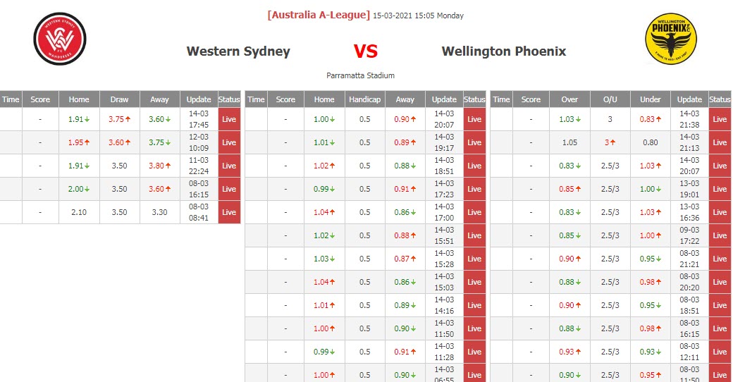BIẾN ĐỘNG TỶ LỆ KÈO CHẤP WS WANDERERS VS WELLINGTON PHOENIX