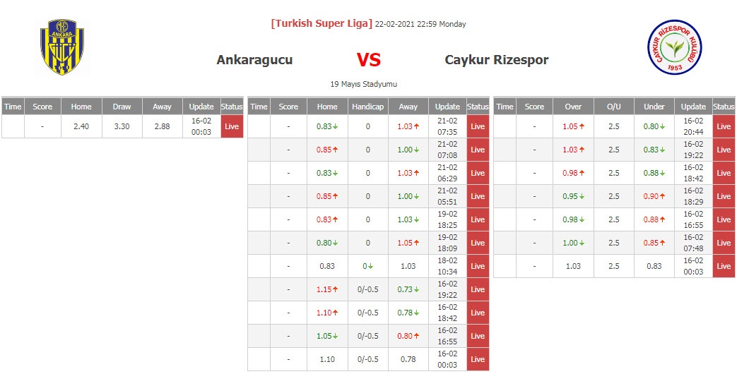 BIẾN ĐỘNG TỶ LỆ KÈO CHẤP ANKARAGUCU VS RIZESPOR