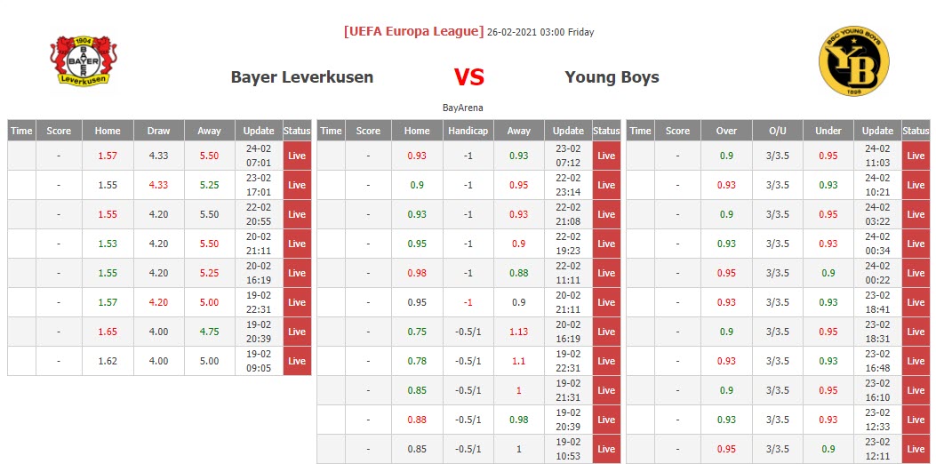 Theo đánh giá của giới điều hành châu Á, Leverkusen là đội bóng sáng cửa giành chiến thắng ở trận đấu lượt về vòng 1/16 cúp C2 châu Âu trước Young Boys. Bằng chứng, giới cầm cân nảy mực đã đưa ra mốc kèo Leverkusen chấp thắng một ăn nửa ở thời điểm công khai trên sàn giao dịch châu Á.