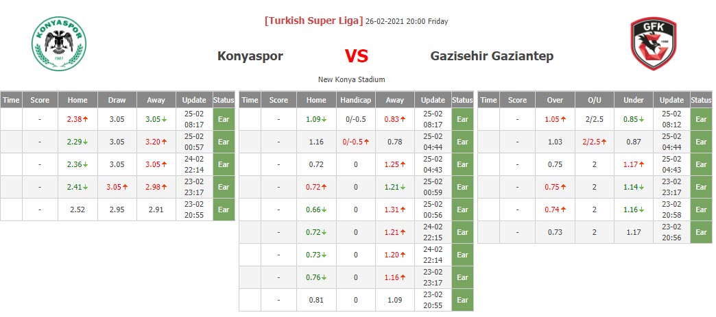 Tại thời điểm công khai tỷ lệ cược trên sàn giao dịch châu Á, giới điều hành thị trường đánh giá cơ hội chiến thắng được ghi đều cho cả Konyaspor và Gazisehir Gaziantep. Cụ thể, họ đã đưa ra kèo chấp hòa được thua ở thời điểm công khai.