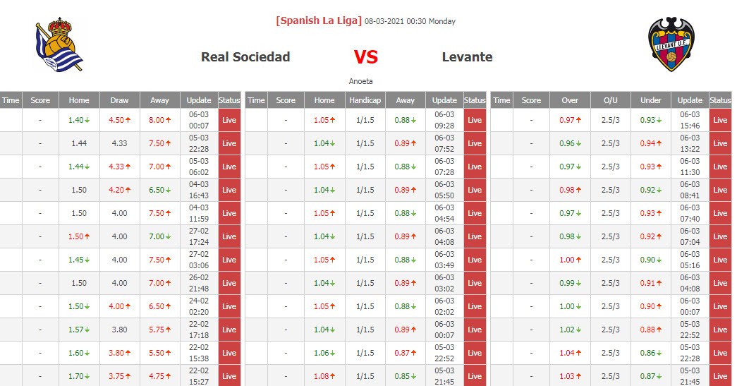 BIẾN ĐỘNG TỶ LỆ KÈO CHẤP SOCIEDAD VS LEVANTE