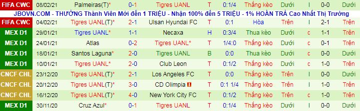 Bên kia sân, Tigres cũng bất bại 4 trận gần nhất ở mọi sân chơi. 5/6 trận gần nhất của Tigres ở mọi đấu trường có dưới 3 bàn. Với thực lực yếu hơn, gần như chắc chắn Tigres UANL sẽ lựa chọn nhập cuộc chậm và chủ động phòng ngự số đông trước Bayern Munich. Đây là thế trận khó mang lại tín hiệu tíc cức cho những người chơi hi vọng tổng bàn thắng trận đấu cao.