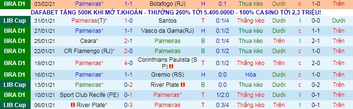 + Thống kê 10 trận gần nhất của Palmeiras vs Tigres UANL