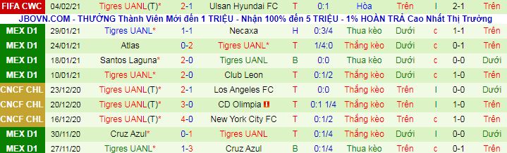 Thực tế đó là kịch bản thường diễn ra trong các trận đấu gần đây của Tigres UANL khi cả 5 trận gần nhất của họ trên mọi đấu trường đều không lần nào vượt qua 10 quả phạt góc/trận. Với lối chơi thiên về kiểm soát bóng vào các pha tấn công trung lộ, không ngạc nhiên khi các trận đấu của Tigres UANL khan hiến các pha bóng từ chấm phạt góc.