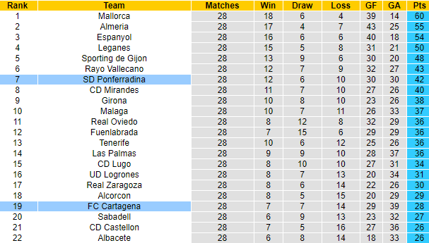 Sau 28 vòng đấu tại giải hạng 2 Tây Ban Nha mùa này, Ponferradina mới ghi được 30 bàn thắng, Cartagena xé lưới đối thủ 29 lần. Lối chơi của hai đội bóng này đều rất thận trọng, 2 trận đối đầu gần đây giữa họ chỉ có tổng cộng 3 bàn thắng được ghi.