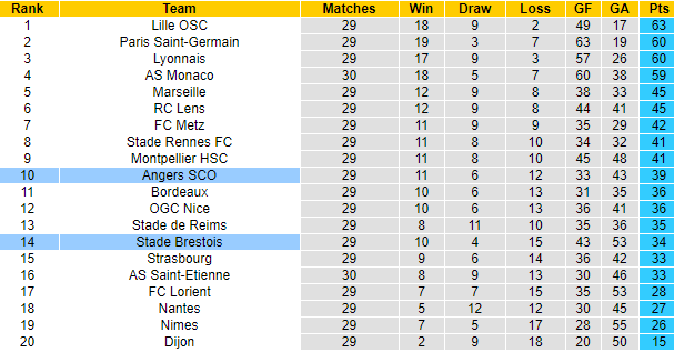 Mùa giải này Brest nỗ lực thay đổi lối chơi, họ sẵn sàng đôi công trước mọi đối thủ. Trong vòng 10 trận gần đây của Brest, 8 trận khép lại với tối thiểu 3 pha lập công. Bên phía đối diện, trong vòng 10 trận vừa qua của Angers, 7 trận cũng kết thúc với kịch bản có từ 3 pha lập công trở lên.