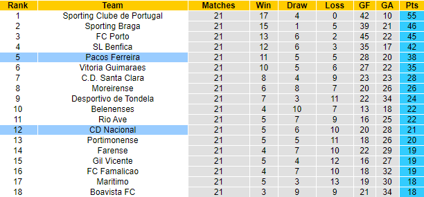 Cả 7 trận tiếp khách gần đây của Pacos Ferreira tại giải VĐQG Bồ Đào Nha đều khép lại với chỉ tối đa 8 quả phạt góc. Lối chơi thận trọng và thi đấu chắc chắn từ giữa sân của Pacos Ferreira khiến bóng ít khi tiếp cận khu vực đường biên ngang. Trong khi đó Nacional trong vòng 7 trận sân khách gần đây chỉ tạo ra tổng cộng 15 quả phạt góc.