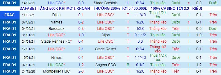 + Thống kê 10 trận gần nhất của Lille
