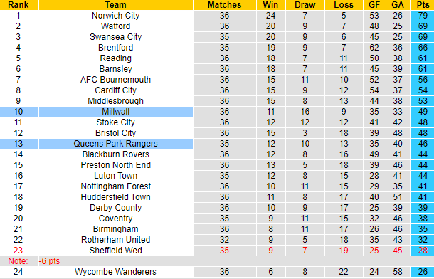 QPR đá 35 trận từ đầu mùa và cũng mới có 35 lần xé lưới đối thủ. Trận đấu sắp tới QPR mất 2 cầu thủ tấn công vì chấn thương là Luke Amos và Tom Carroll nên khả năng ghi nhiều bàn thắng của họ càng bị nghi ngờ. Bên phía đối diện, Millwall mất 4 trụ cột vì lý do tương tự.