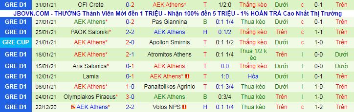 Bên kia sân, AEK Athens bất bại 7/8 trận vừa qua, trong đó có 6 chiến thắng. Đáng chú ý, 6 trong 8 trận đấu kể trên của đội khách cũng chỉ có tối đa 2 bàn mỗi trận. Với thông số như vậy, giới chuyên gia thiên về khả năng AEK Athens sẽ là đội giành chiến thắng hôm nay nhưng tổng số bàn thắng trận đấu này khó lòng vượt qua con số 2.