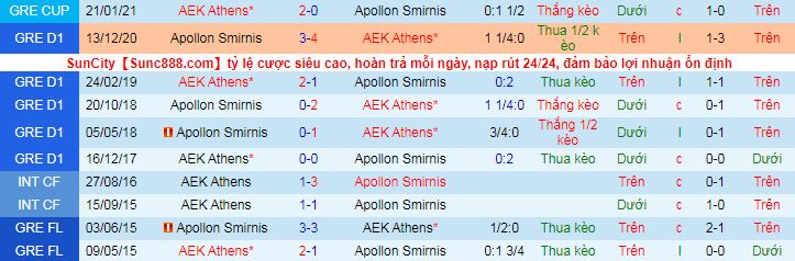+ Lịch sử đối đầu Apollon Smyrni vs AEK Athens