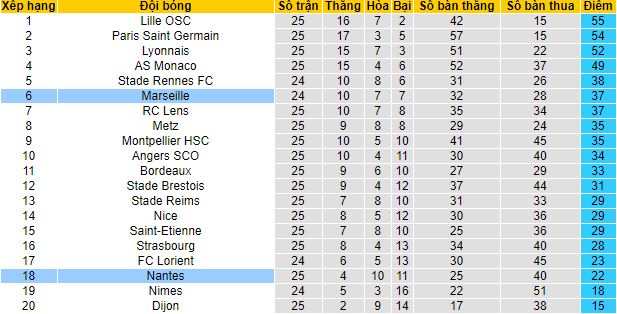 Nantes đang có phong độ cực kỳ tệ hại tại mùa giải năm nay. Ra sân 25 lần, thế nhưng đoàn quân của huấn luyện viên Antoine Kombouaré mới chỉ có được 4 chiến thắng, trong khi có 10 trận hòa, và đã để thua đến 11 lần. Ở vòng đấu gần nhất, Nantes bất ngờ đánh bại Angers ngay trên sân đối thủ với tỷ số 3-1.