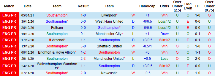 + Thống kê 10 trận gần nhất của Southampton