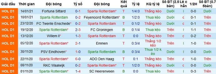 Trong 5 trận đấu gần đây Sparta Rotterdam có được 3 trận thắng và để thua 2 trận. Điều đáng nói là cả 3 trận thắng đội bóng có được đều trên sân khách, trong khi trên sân nhà Sparta Rotterdam cũng chỉ có được 2 trận thắng, 3 trận thua ở 5 trận gần nhất tại đây.