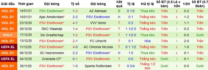 + Thống kê 10 trận gần nhất của PSV Eindhoven