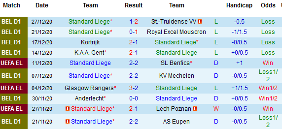 + Thống kê 10 trận gần nhất của Standard Liege