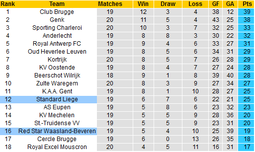 Là tên tuổi lớn của bóng đá Bỉ, đầu mùa năm nay vẫn còn chơi tại Europa League nhưng lúc này Standard Liege thể hiện phong độ thực sự thất vọng. Không nhiều người còn giữ được sự kiên nhẫn với đội chủ nhà khi họ trải qua liên tiếp 8 trận vừa qua ở mọi mặt trận chỉ biết đến hòa và thua.