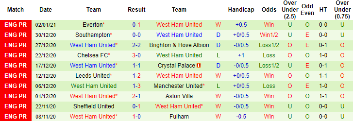 + Thống kê 10 trận gần nhất của West Ham